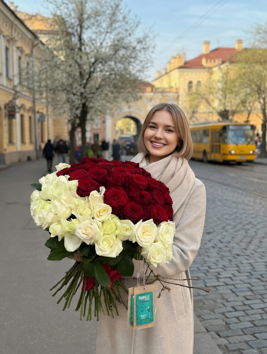 Купить 101 красная и белая роза Королевский с доставкой по Лавагне