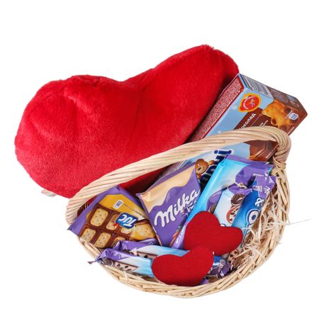 • Состав: Корзина M · Шоколад Milka 90г (6 шт.) · Бисквит Барни · Декоративное сердечко (2 шт.) · Подушка сердце большое · Сено для упаковки