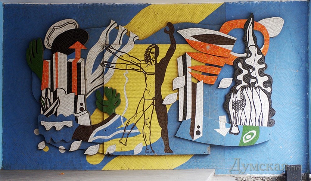 Что может произойти с Витрувианским человеком, начни он работать в "Одескоммунпроекте", можно увидеть на мозаике, украшающей высотку на Терешковой, 15.