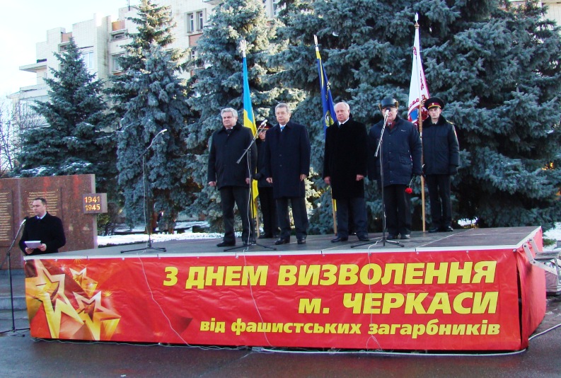 Сьогодні у м. Черкаси відбувся урочистий мітинг з нагоди 70-річчя визволення міста від фашистських загарбників. У ньому взяли участь керівництво міської та обласної влади, ветерани Великої Вітчизняної війни, на чолі з головою міської організації Ради Ветеранів України Іваном Губським, громадськість міста.З вітальним словом виступив на мітингу секретар міської ради, в.о. міського голови Черкас Віктор Білоусов.