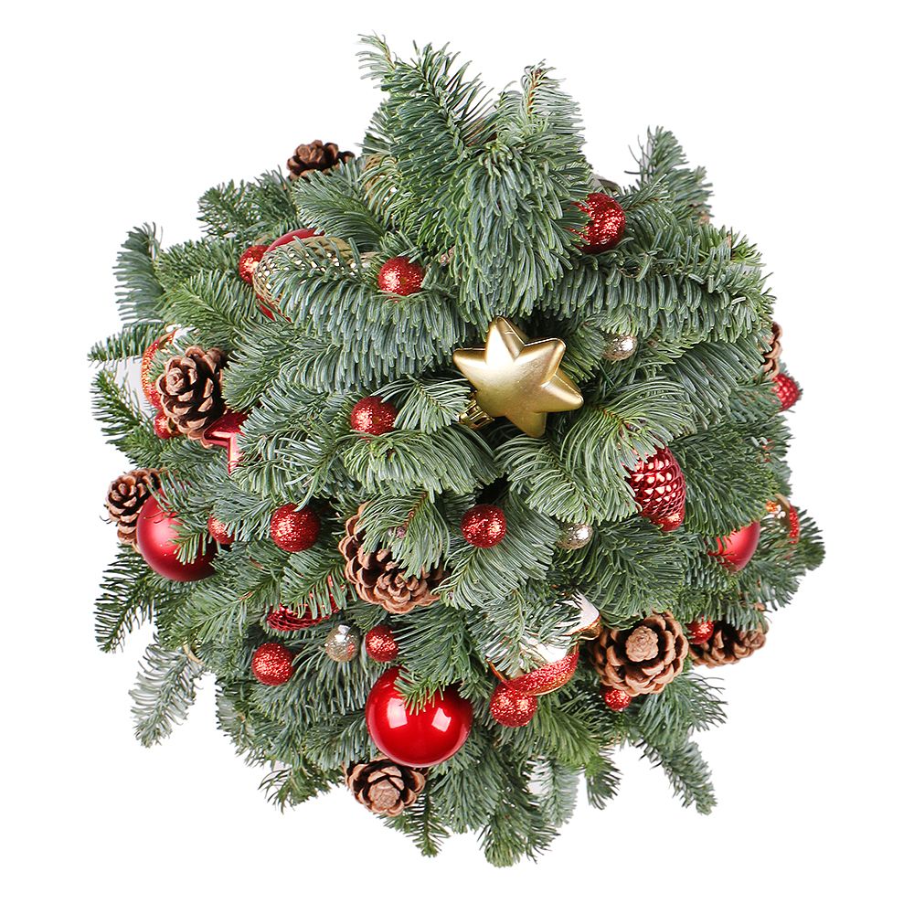 • Состав: Новогодний декор · Шишка (11 шт.) · Елочные игрушки (20 шт.) · Коробка круглая большая · Веточка ели (20 шт.)