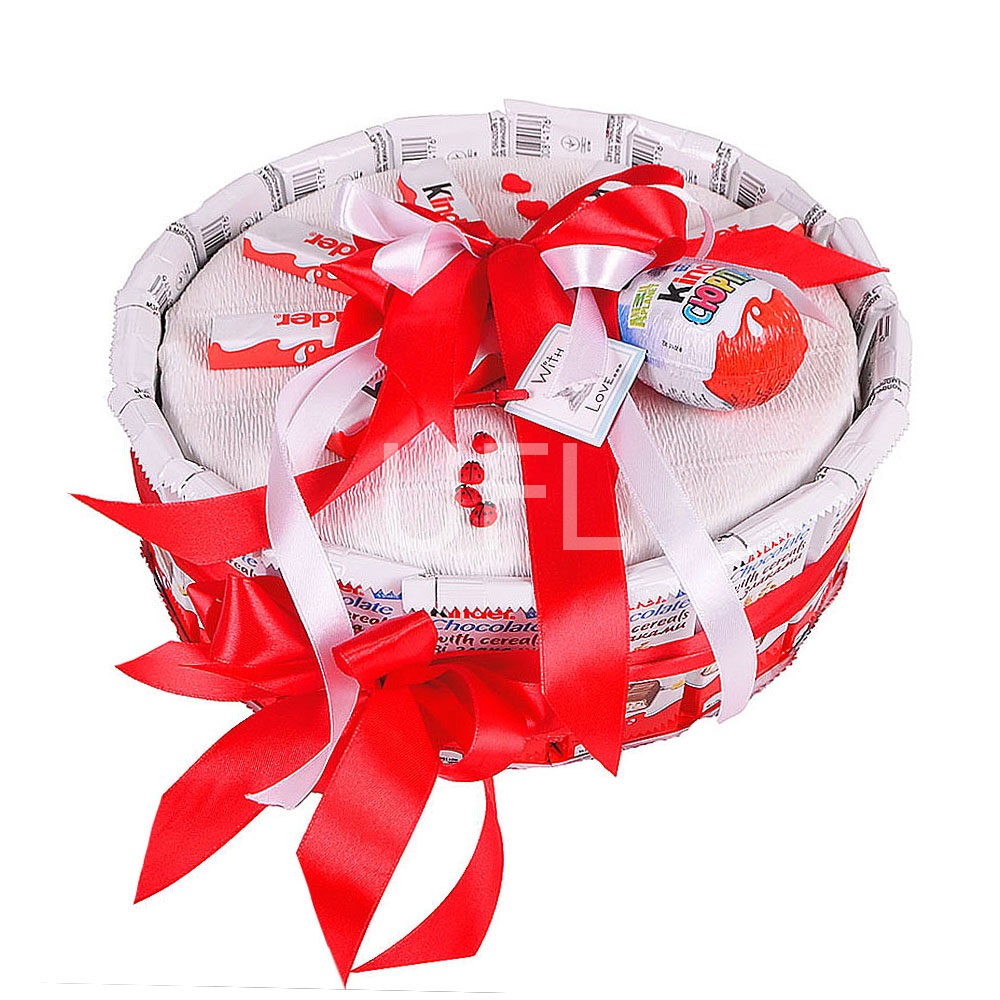 • Состав: Яйцо Kinder сюрприз · Kinder chocolate 100 г · Шоколад молочный Kinder Chocolate со злаками (17 шт.) · Лента на цветы (2 шт.) · Декоративные элементы в букеты цветов