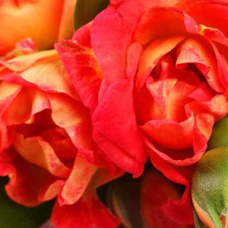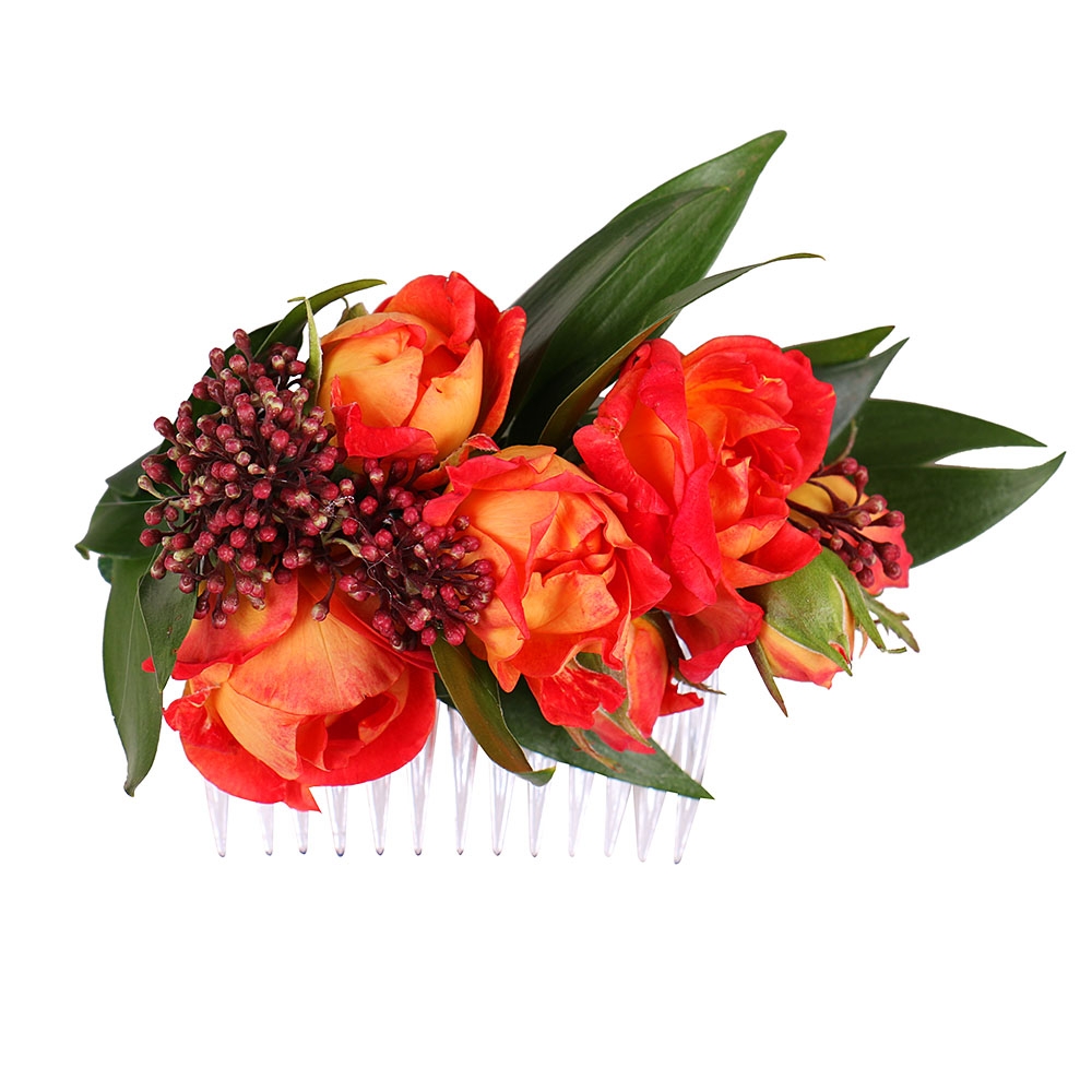 • Состав: Роза кустовая оранжевая · Скиммия · Зелень в букет