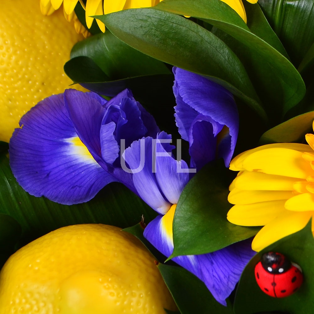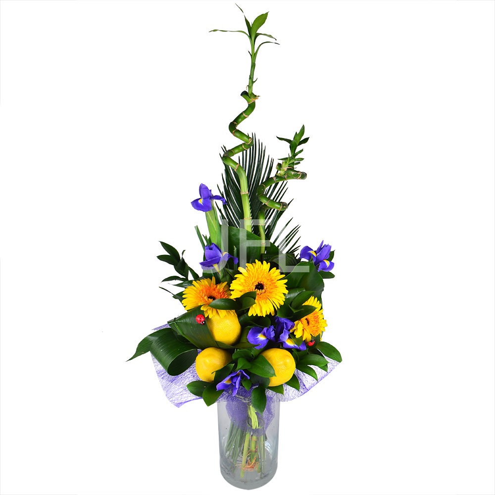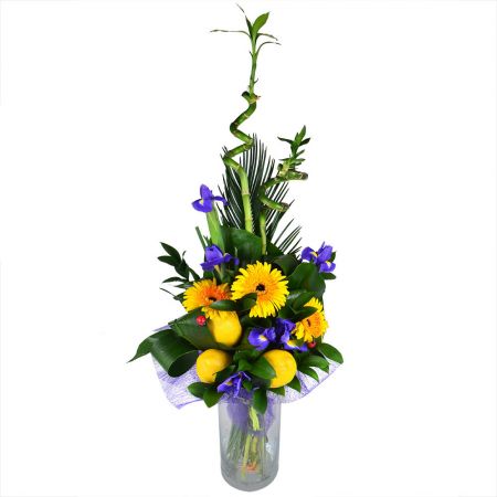 • Состав: Бамбук (ветка) (2 шт.) · Ирисы синие (5 шт.) · Гербера жёлтая (3 шт.) · Лимон (3 шт.) · Зелень в букет (2 шт.) · Упаковать букет цветов · Декоративные элементы в букеты цветов (2 шт.) · Лента на цветы