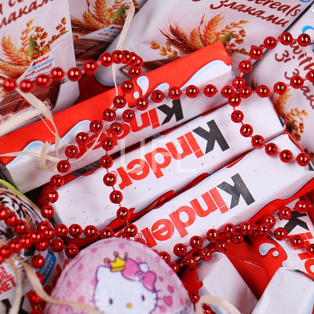 • Состав: Яйцо Kinder сюрприз (7 шт.) · Корзина M · Лента на цветы · Шоколад молочный Kinder Chocolate со злаками (5 шт.) · Kinder Bueno с молочным шоколадом (5 шт.) · Kinder chocolate 21 г (12 шт.) · Бант