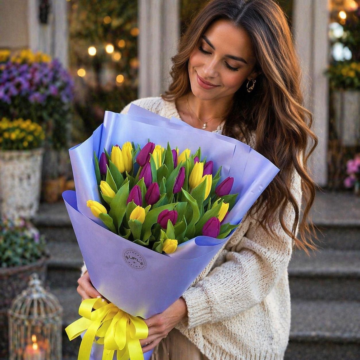 Купить 25 желтых и фиолетовых тюльпанов с доставкой по Поти