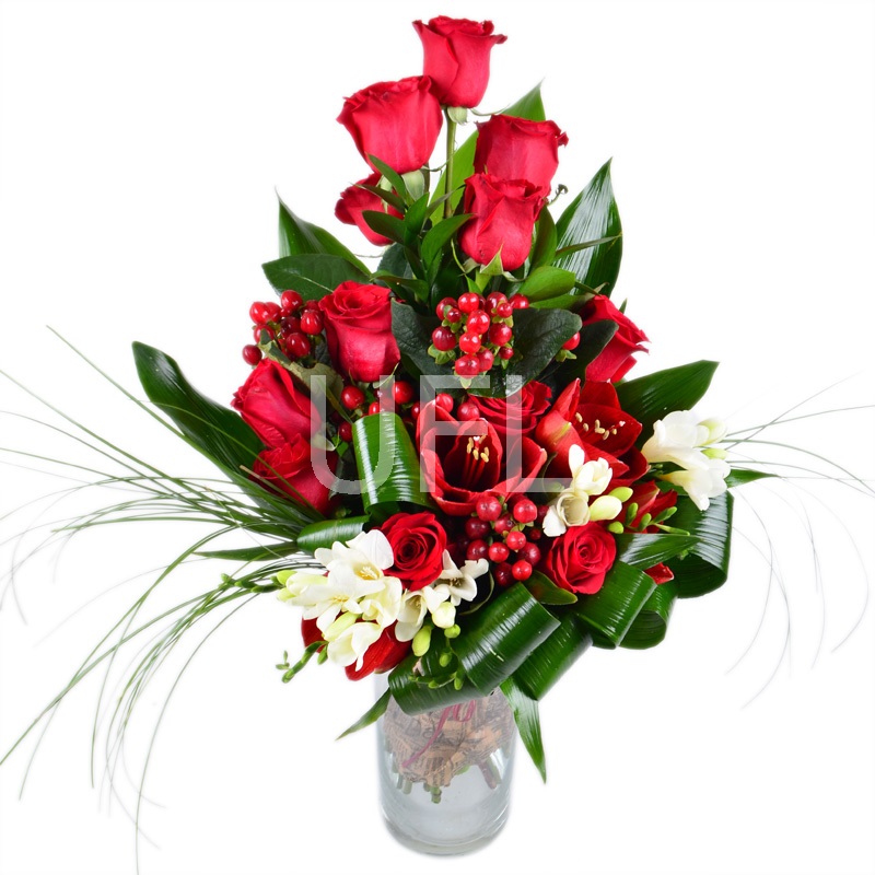 • Состав: Роза красная до 50 см (13 шт.) · Амариллис красный (2 шт.) · Гиперикум красный (3 шт.) · Фрезия белая (3 шт.) · Зелень в букет · Упаковать букет цветов · Лента на цветы