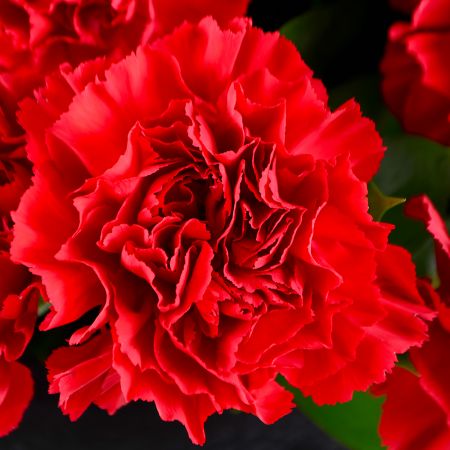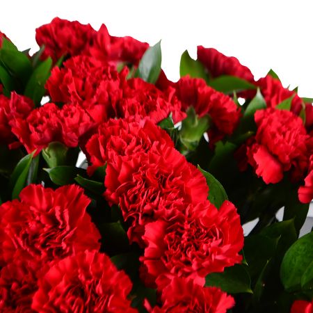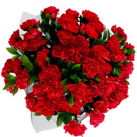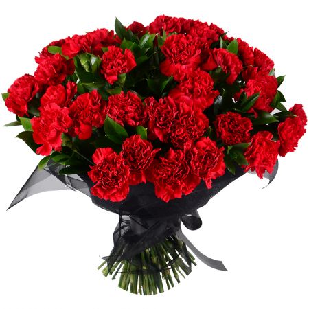 • Состав: Гвоздика красная (50 шт.) · Упаковать букет цветов · Лента на цветы · Зелень в букет