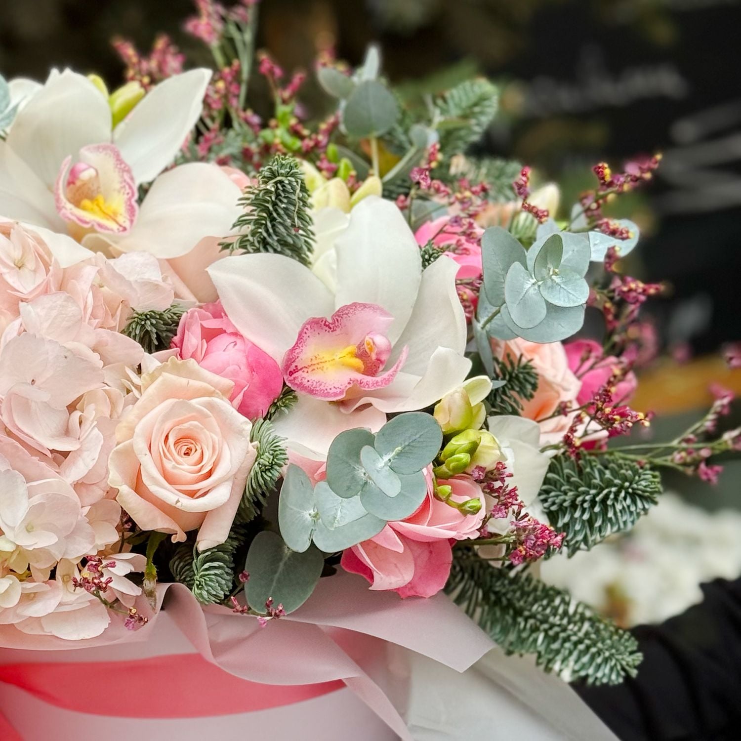 • Состав: Гортензия розовая · Цимбидиум белый (цветок орхидея) (2 шт.) · Роза кремовая Кимберли до 60 см (5 шт.) · Роза Сильва Пинк Баблз (3 шт.) · Фрезия белая (2 шт.) · Лимониум · Ветка ели · Оазис на цветы в коробке или композиции · Коробка круглая L · Лента на цветы · Эвкалипт