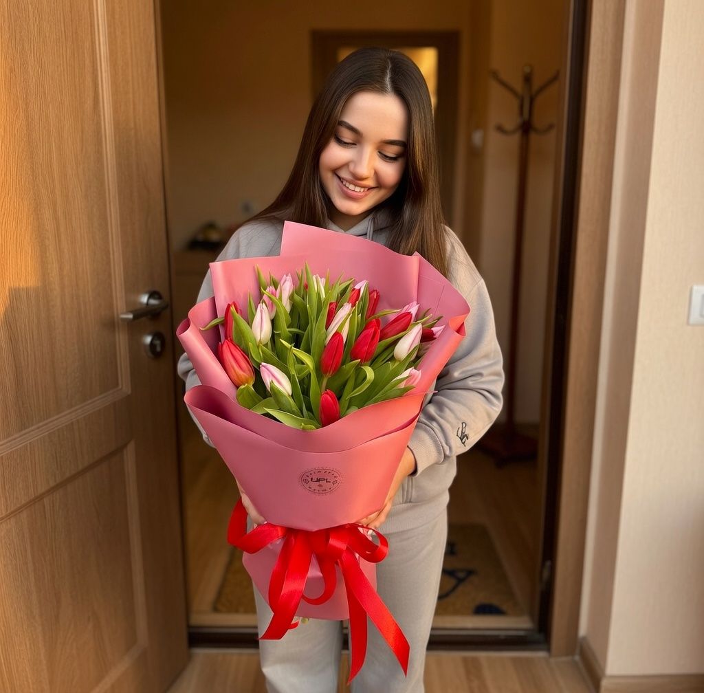Купить 25 красных и розовых тюльпанов с доставкой по Соледару