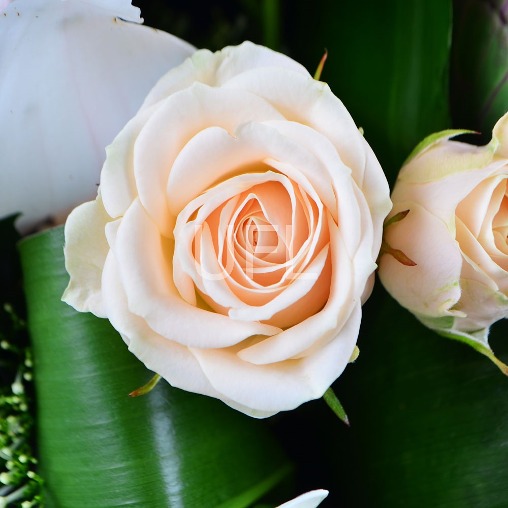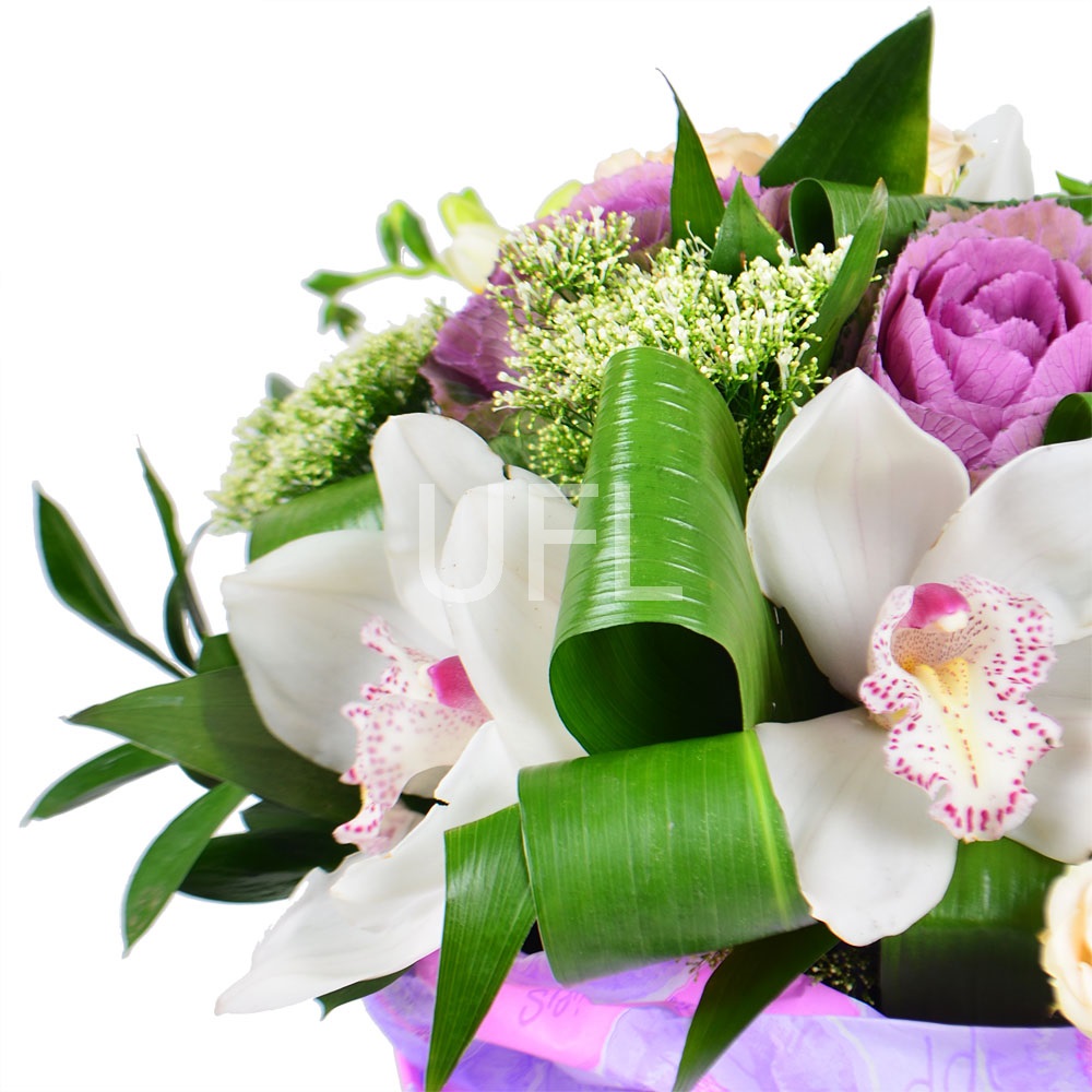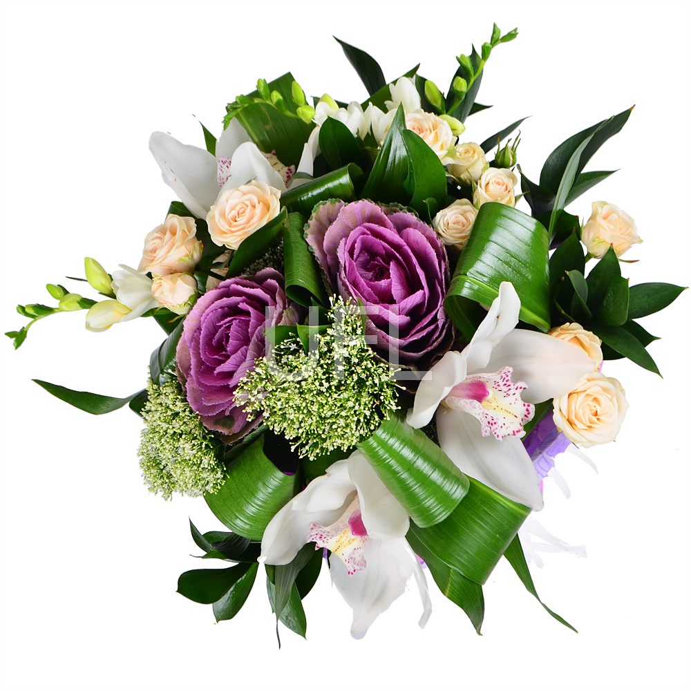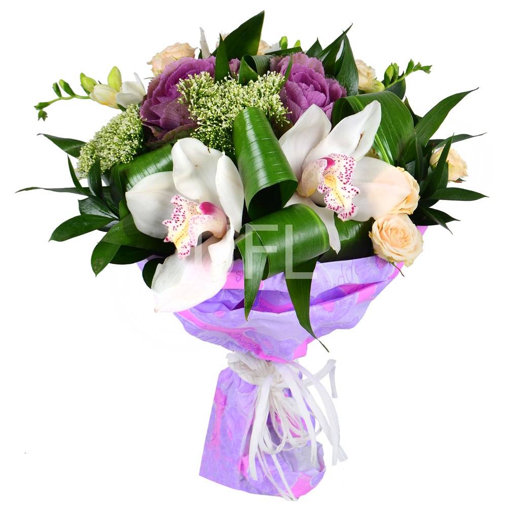 • Состав: Роза кустовая кремовая (4 шт.) · Фрезия белая (3 шт.) · Зелень в букет (2 шт.) · Упаковать букет цветов · Лента на цветы · Брассика фиолетовая (2 шт.) · Цимбидиум белый (цветок орхидея) (3 шт.) · Трахелиум белый (3 шт.)