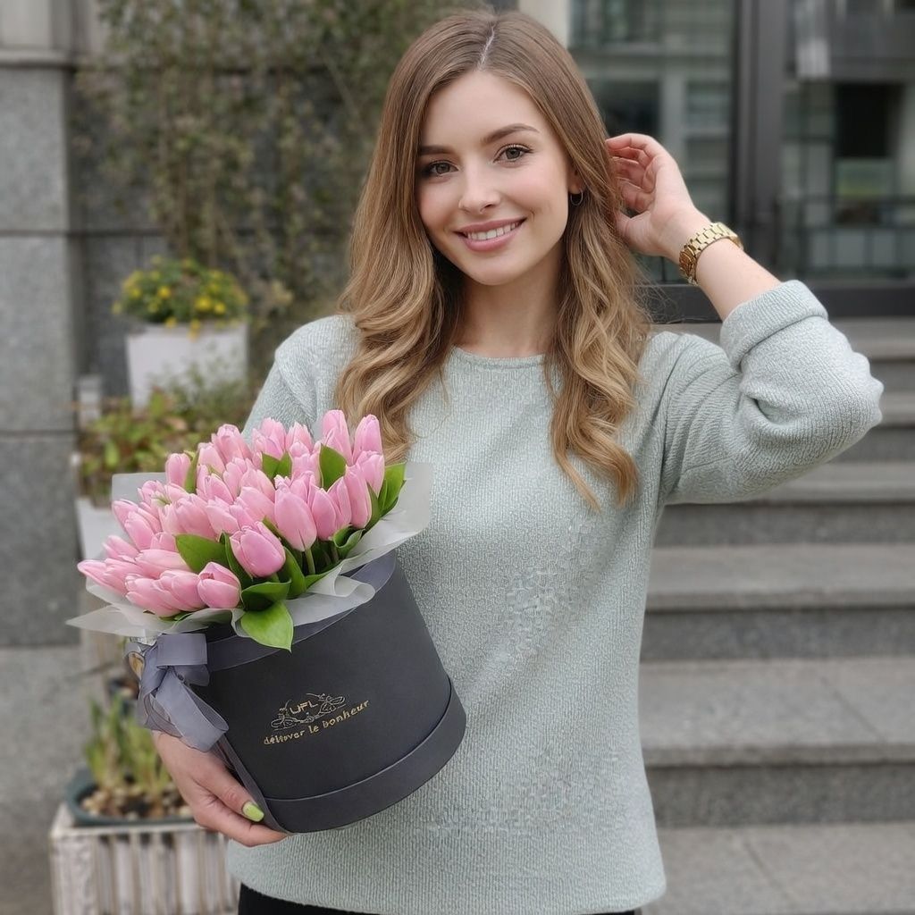 В Токио Розовые тюльпаны в коробке 45шт часто выбирают для поздравлений, романтических моментов и праздников. Такой букет часто выбирают для любимого человека.
