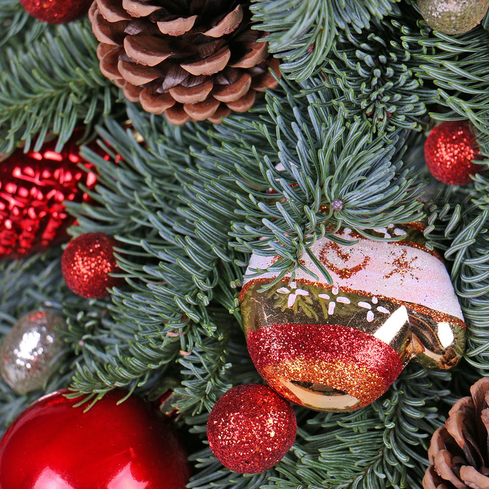 • Состав: Новогодний декор · Шишка (11 шт.) · Елочные игрушки (20 шт.) · Коробка круглая большая · Веточка ели (20 шт.)