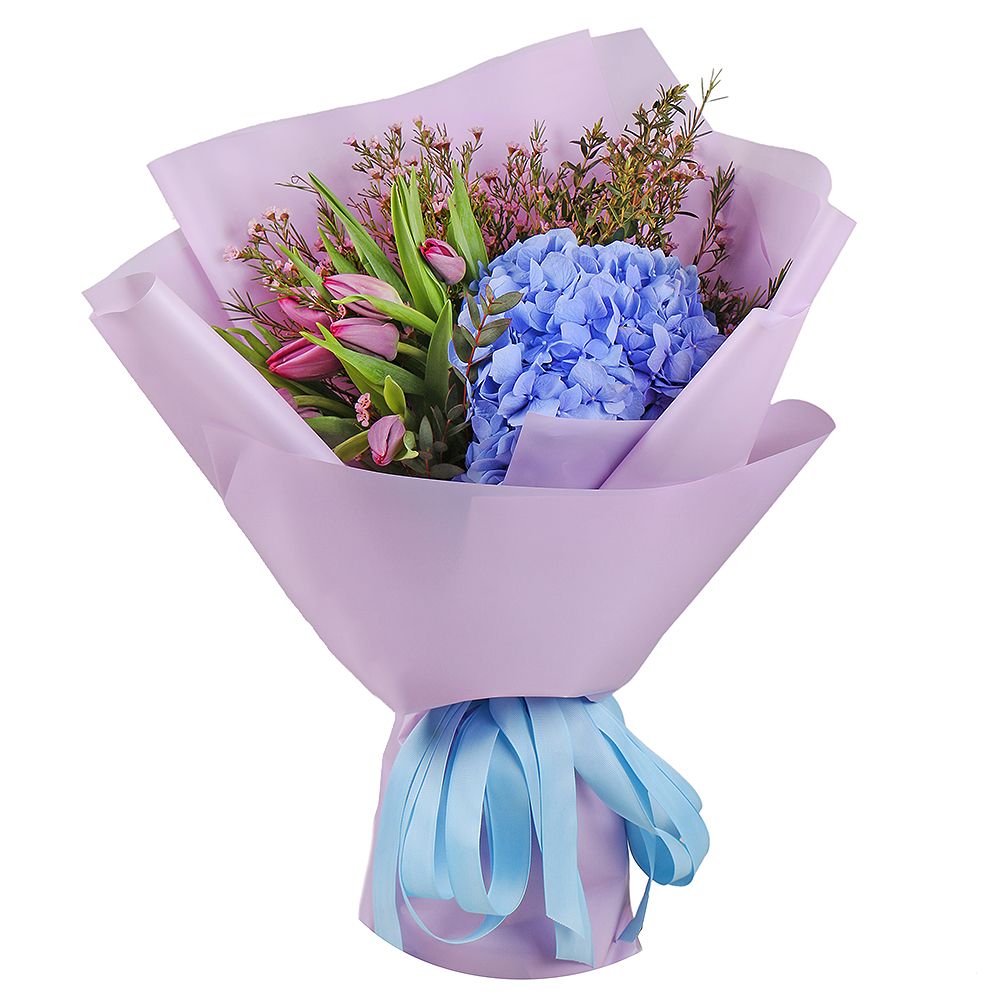 Купити Блакитна гортензія і тюльпани з доставкою по Ангрену