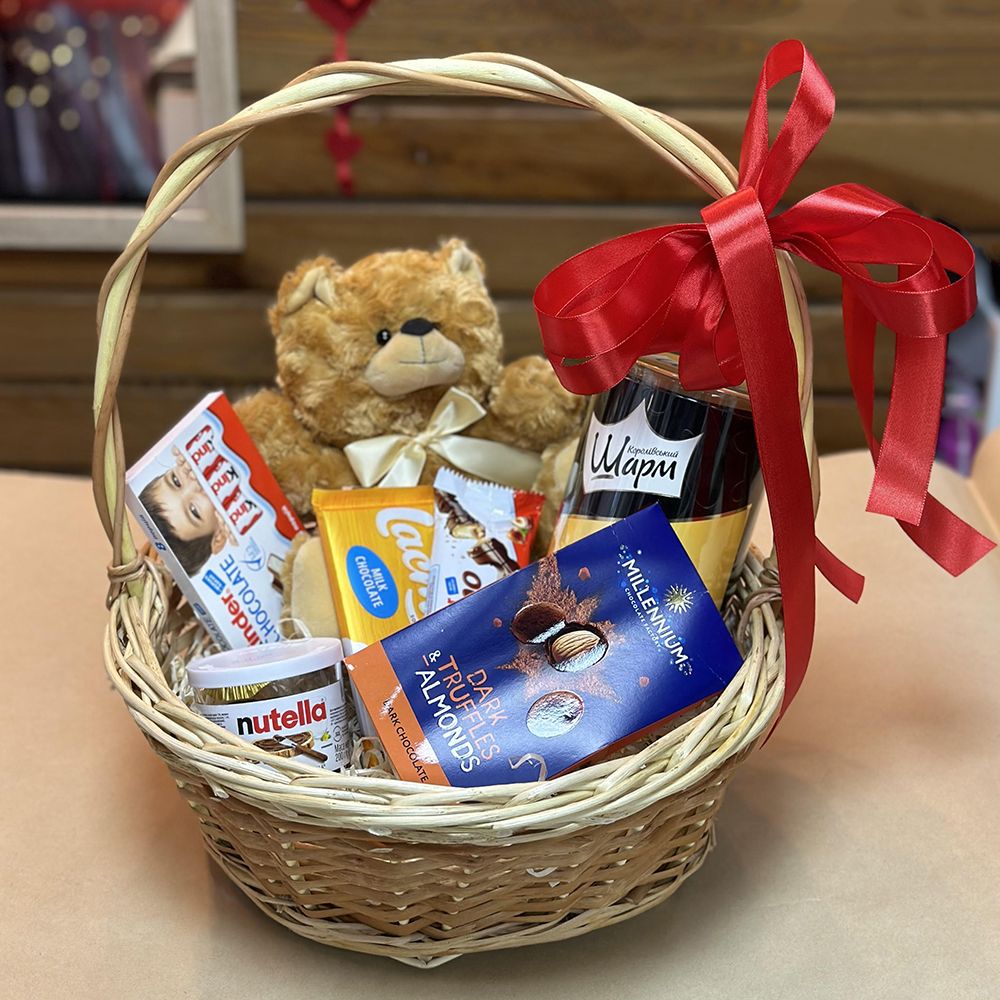 • Склад: Кошик M · Іграшка Ведмедик кремовий 25 см · Nutella 200г · Цукерки Millennium Truffles · Kinder Bueno з молочним шоколадом · Шоколад молочний плитка 90г · цукерки в тубусі · Kinder chocolate 100 г