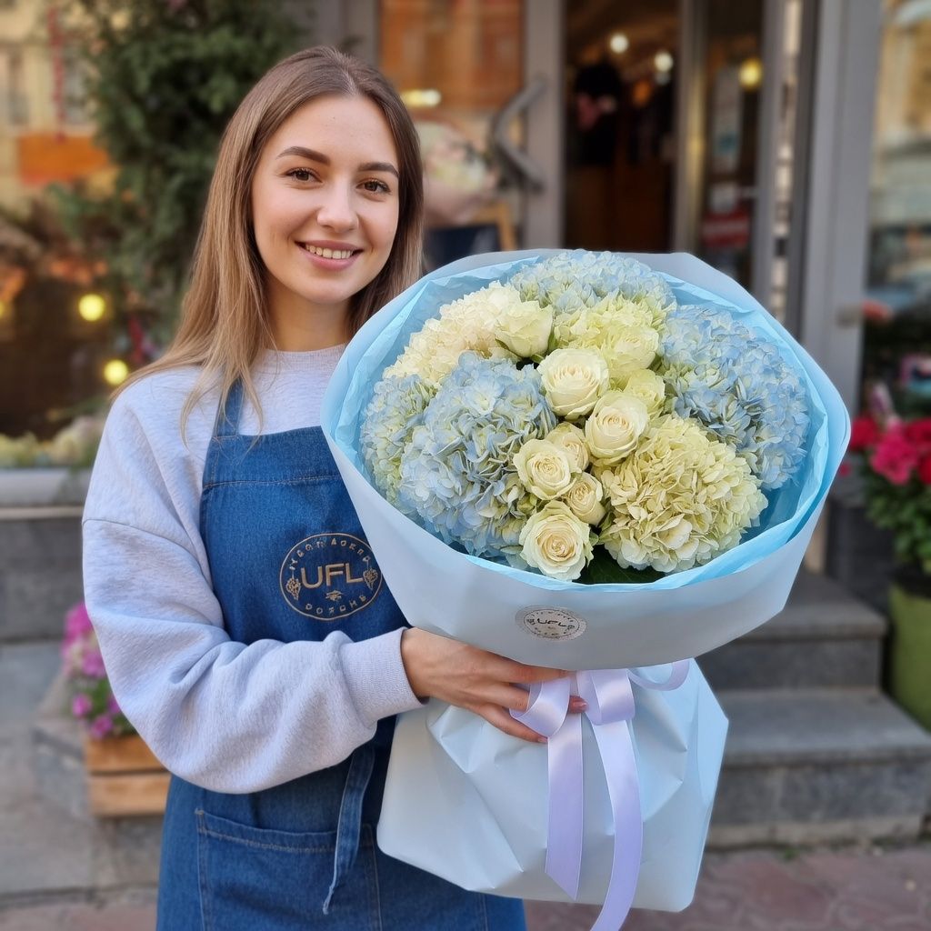 Купити Небесний букет гортензій і троянд з доставкою по Бретниг-Хаусвальде