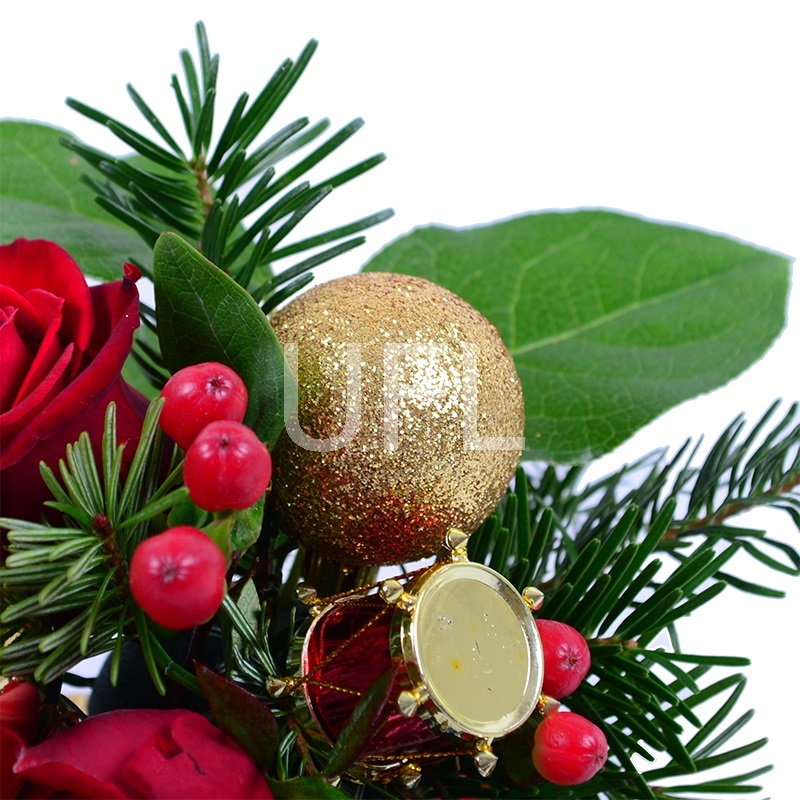 • Склад: Цукерки Ferrero Rocher 200 г · Новорічний декор · Троянда червона до 50 см (2 шт.) · Новорічні кульки (2 шт.) · Гіперікум червоний · Ялина жива · Міні деко