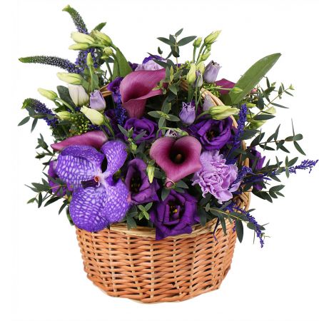 • Склад: Орхідея Ванда · Кали фіолетова (3 шт.) · Гвоздика фіолетова (3 шт.) · Еустома фіолетова (3 шт.) · Вероніка (2 шт.) · Солидаго (2 шт.) · Скімія · Зелень у букет (2 шт.) · Оазис · Кошик M