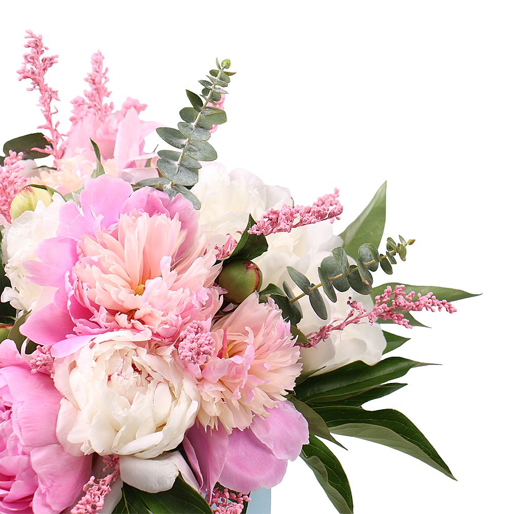 • Склад: Стрічка на квіти · Оазис · Солидаго · Коробка кругла S 13x14 см · Півонія рожева (9 шт.) · Півонія біла (8 шт.)