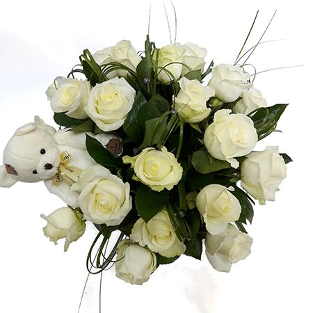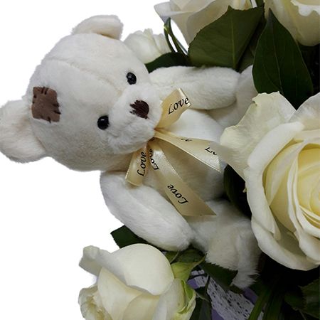 • Склад: Троянда біла місцева до 60 см (23 шт.) · Іграшка Ведмедик Teddy 15 см · Коробка кругла велика · Оазис (2 шт.) · Стрічка на квіти · Зелень у букет