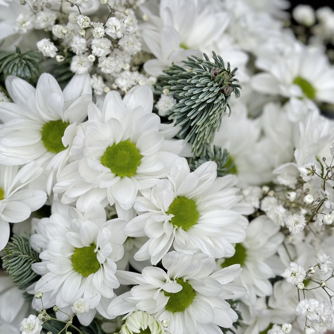 • Склад: Хризантема біла ромашка (5 шт.) · Гіпсофіла біла · Коробка кругла M 20x21см · Стрічка на квіти · Оазис · Гілка ялинки 1/2