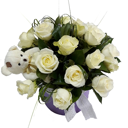 • Склад: Троянда біла місцева до 60 см (23 шт.) · Іграшка Ведмедик Teddy 15 см · Коробка кругла велика · Оазис (2 шт.) · Стрічка на квіти · Зелень у букет