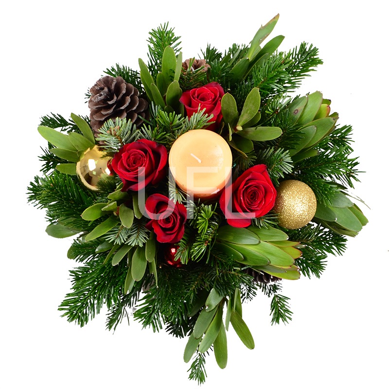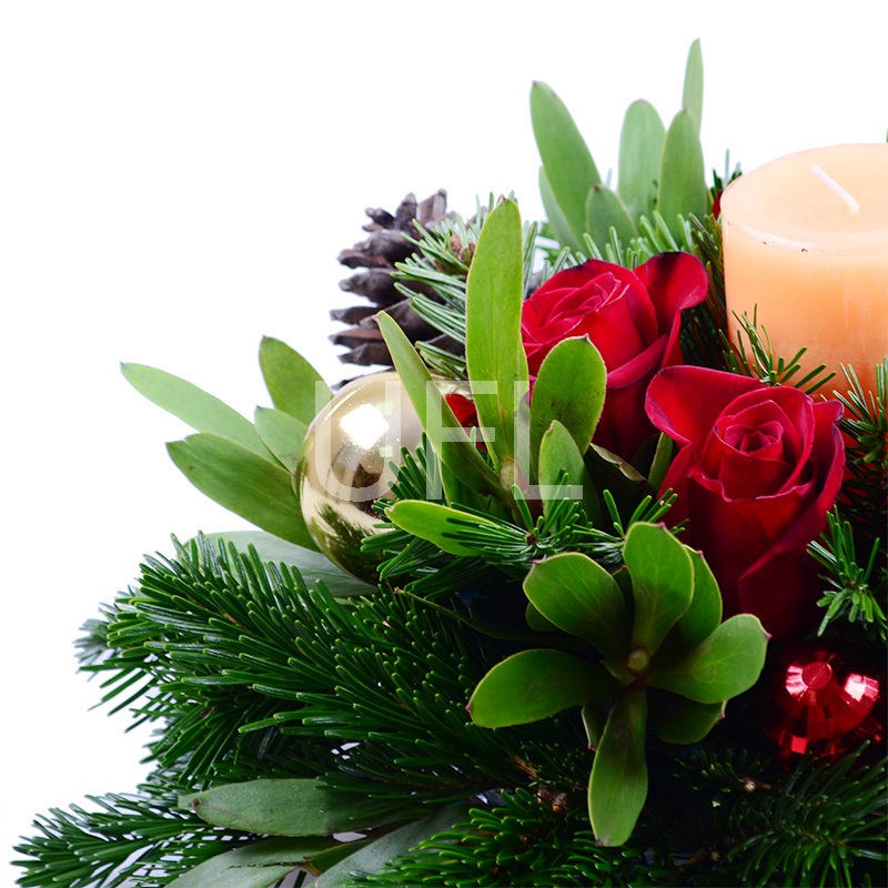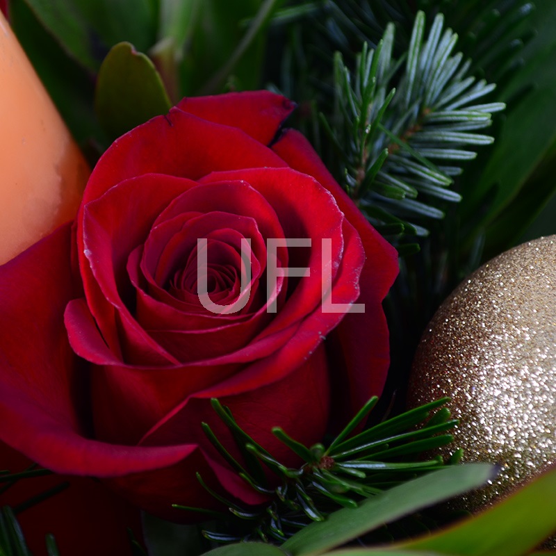 • Склад: Троянда червона до 50 см (4 шт.) · Леукодендрон (3 шт.) · Шишки (4 шт.) · Оазис · Новорічні кульки (4 шт.) · Гілочка ялинки (5 шт.)