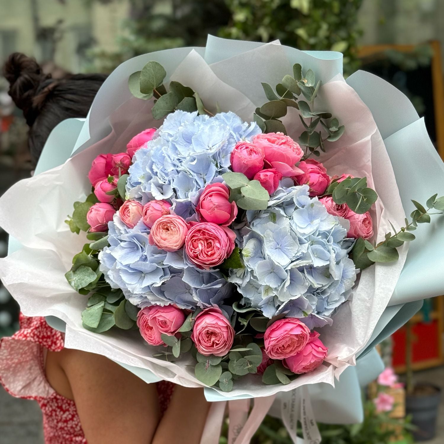 Купити Блакитна гортензія та троянди з доставкою по Уй