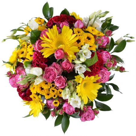 • Склад: Гербера жовта (5 шт.) · Троянди кущові рожеві (5 шт.) · Еустома біла (5 шт.) · Хризантема ромашкова жовта (4 шт.) · Целозія (4 шт.)