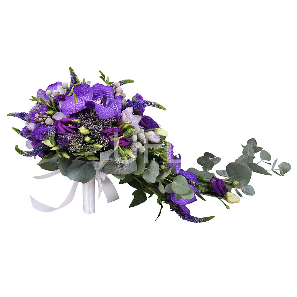 • Склад: Орхідея Ванда (4 шт.) · Еустома фіолетова (2 шт.) · Евкаліпт (2 шт.) · Фрезія біла (5 шт.) · Еустома біла (2 шт.) · Трахеліум фіолетовий (3 шт.) · Брунія (3 шт.) · Портбукетниця · Стрічка на квіти · Вероніка (9 шт.) · Статиця синя (2 шт.)