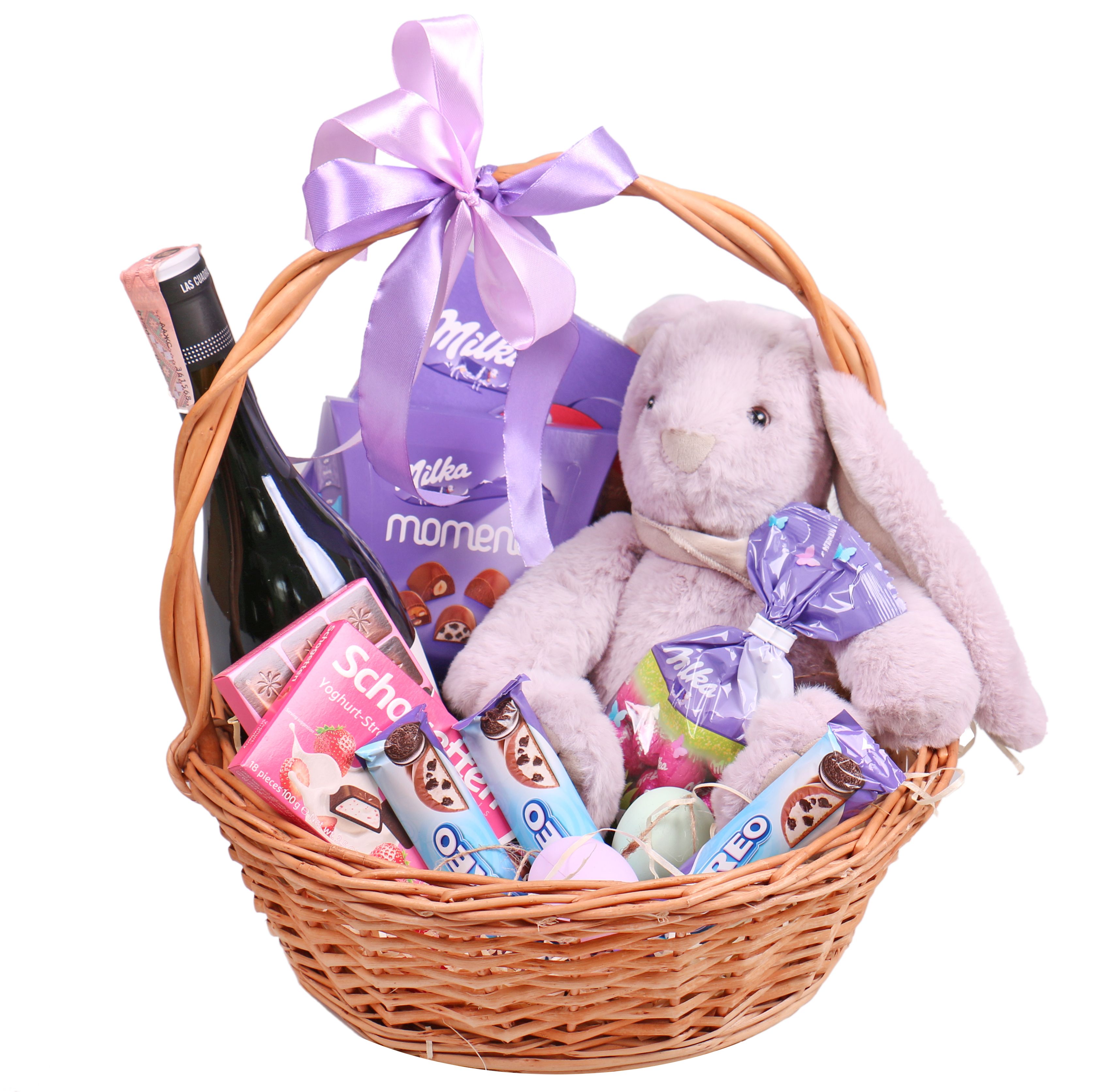 • Склад: Кошик M · Вино червоне · Шоколад Schogetten (2 шт.) · Шоколадний батончик Milka&Oreo 37 г (3 шт.) · Цукерки Milka 100 г (3 шт.) · Зайчик плюшевий · Пасхальні яйця декоративні (3 шт.)