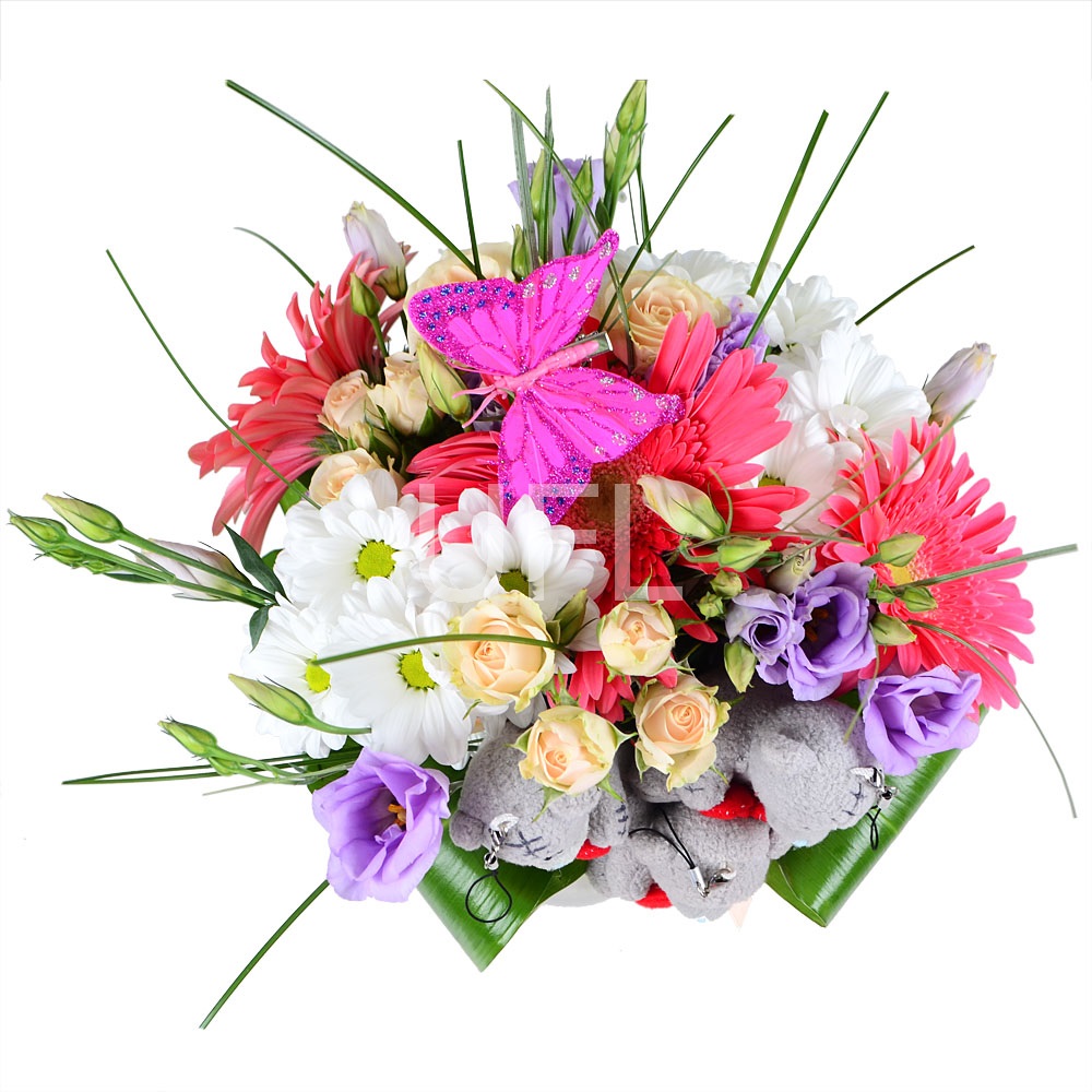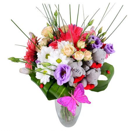 • Склад: Гербера рожева (3 шт.) · Троянда кущова кремова (2 шт.) · Еустома фіолетова · Берграсс · Іграшка Ведмедик 5-10 см (3 шт.) · Метелики декоративні · Зелень у букет · Хризантема кущова біла