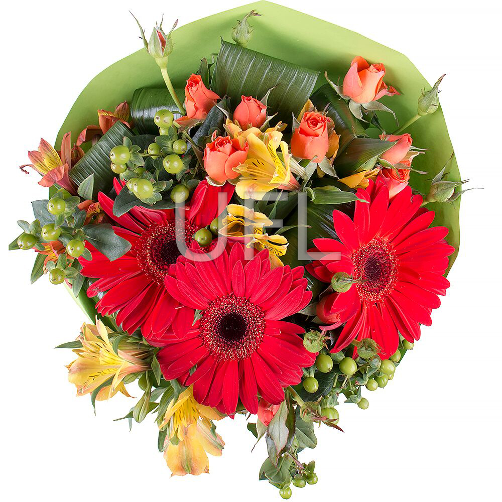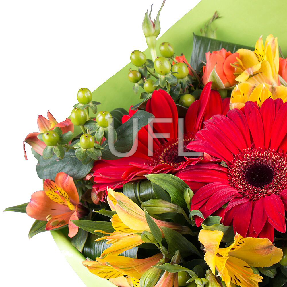 • Склад: Гіперікум зелений (3 шт.) · Троянда кущова помаранчева (2 шт.) · Упаковка на букет квітів · Стрічка на квіти · Альстромерія різнокольорова (3 шт.) · Гербера різнокольорова (3 шт.)