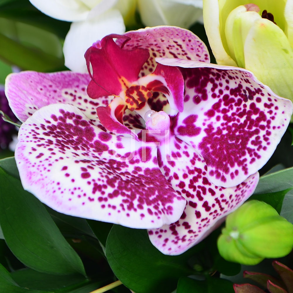 • Склад: Оазис · Лілія біла (2 шт.) · Фрезія біла (3 шт.) · Евкаліпт · Декоративні гілки (2 шт.) · Зелень у букет · Орхидея фаленопсис квітка (3 шт.) · Кашпо L