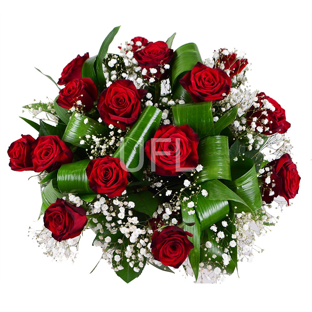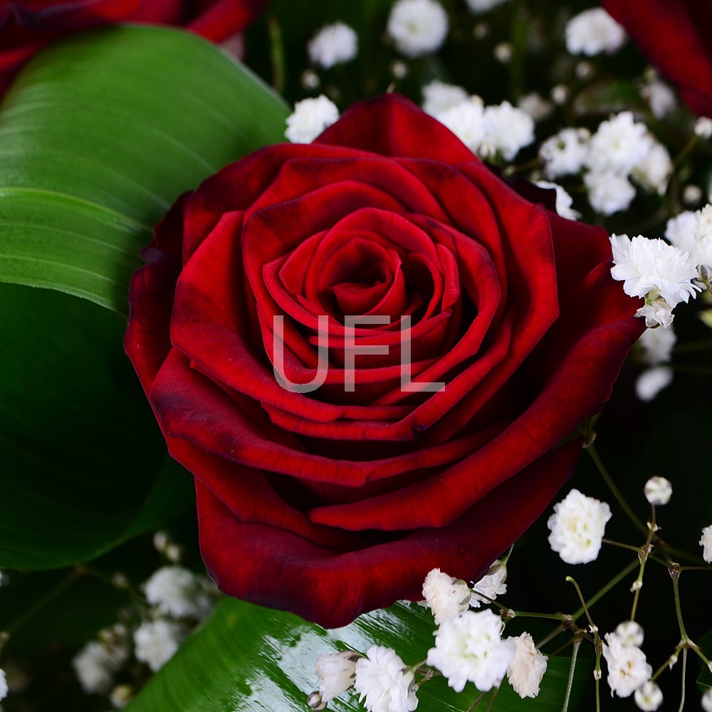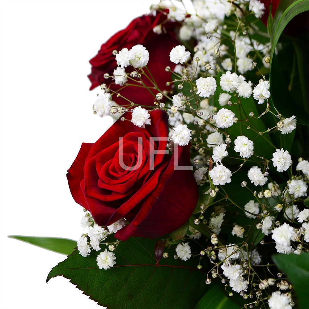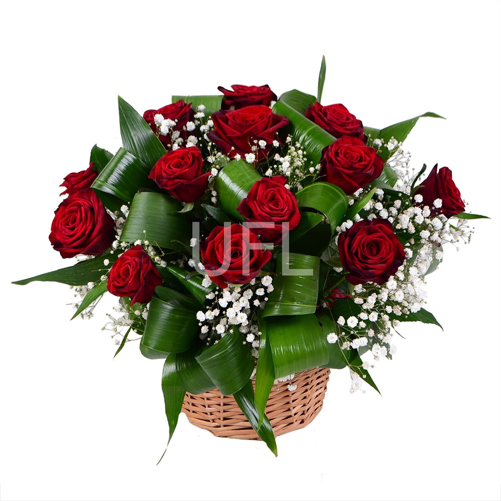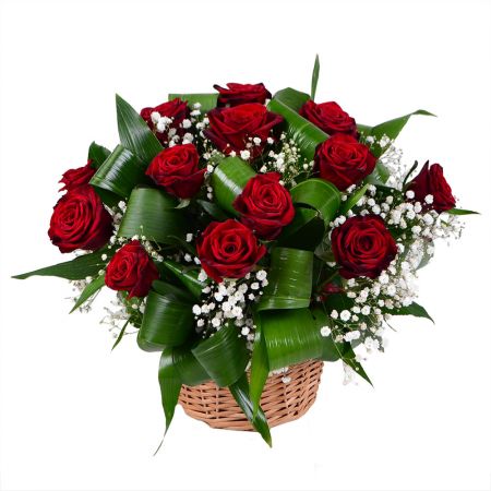 • Склад: Гіпсофіла біла (4 шт.) · Оазис (2 шт.) · Кошик M · Зелень у букет (2 шт.) · Троянди червоні до 50 см (15 шт.)