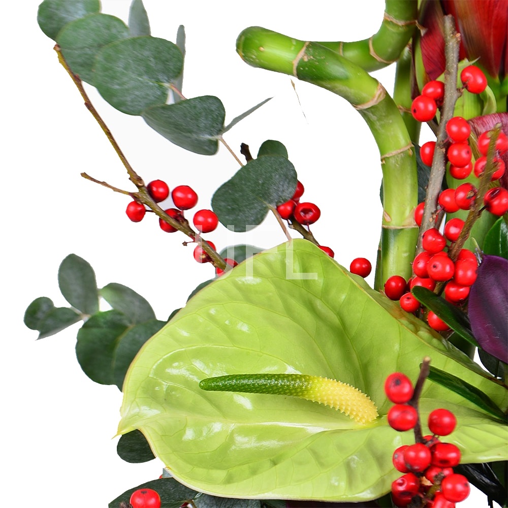 • Склад: Амариліс червоний · Кали фіолетова (5 шт.) · Антуріум зелений (2 шт.) · Бамбук (3 шт.) · Евкаліпт (5 шт.) · Стрічка на квіти · Трахеліум фіолетовий (4 шт.) · Брассика фіолетова (2 шт.) · Ілекс червоній (4 шт.)