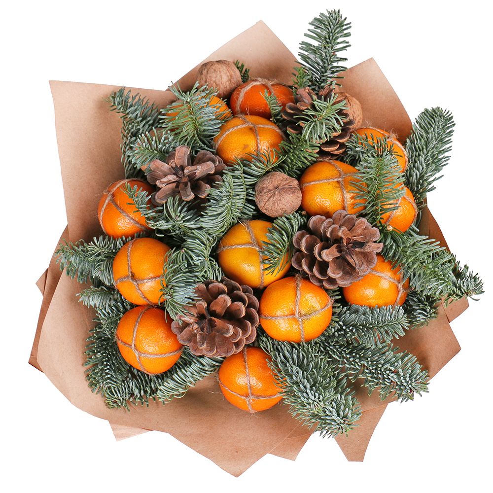 • Склад: Мандарини (13 шт.) · Шишка (5 шт.) · Упаковка на букет квітів (2 шт.) · Стрічка на квіти · Гілка ялинки