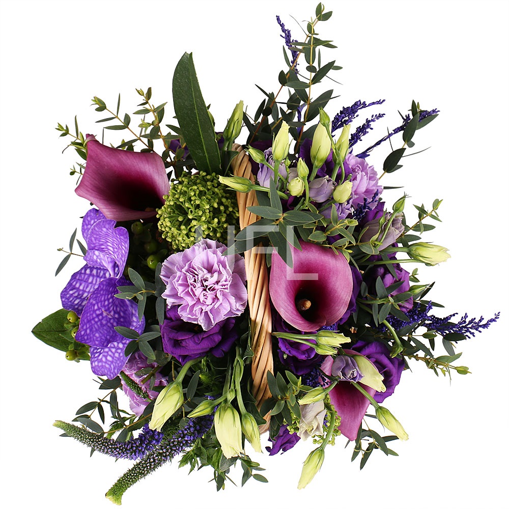 • Склад: Орхідея Ванда · Кали фіолетова (3 шт.) · Гвоздика фіолетова (3 шт.) · Еустома фіолетова (3 шт.) · Вероніка (2 шт.) · Солидаго (2 шт.) · Скімія · Зелень у букет (2 шт.) · Оазис · Кошик M