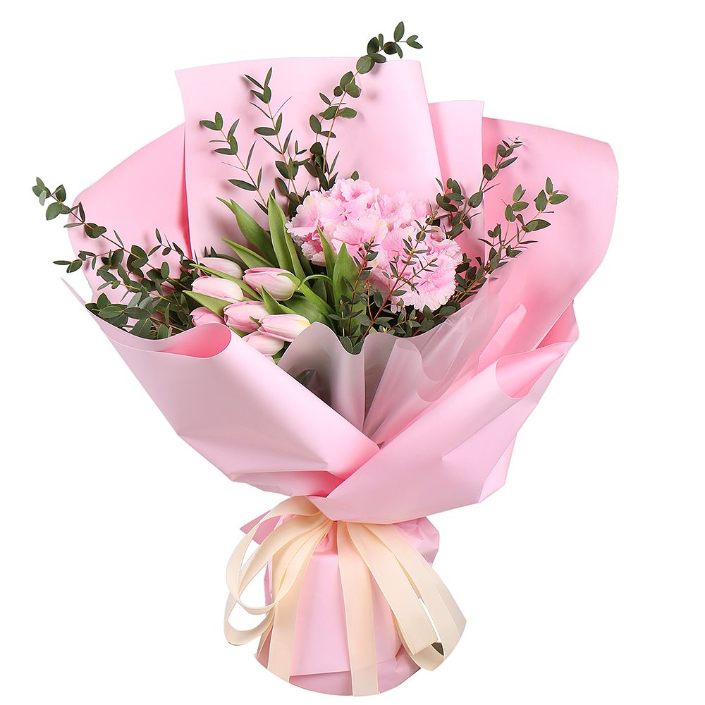 Купити Рожева гортензія і тюльпани з доставкою по Перемишлянам