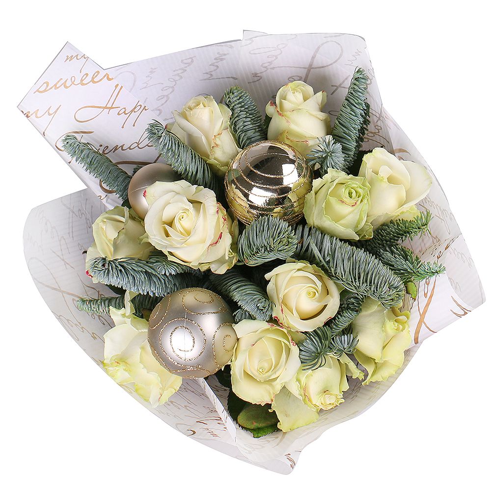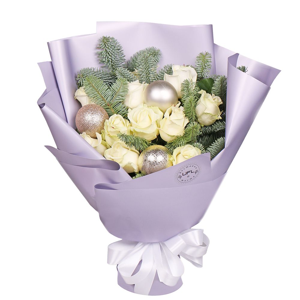 • Склад: Троянда біла місцева до 60 см (11 шт.) · Новорічні кульки (3 шт.) · Упаковка на букет квітів · Стрічка на квіти · Гілочка ялинки (5 шт.)