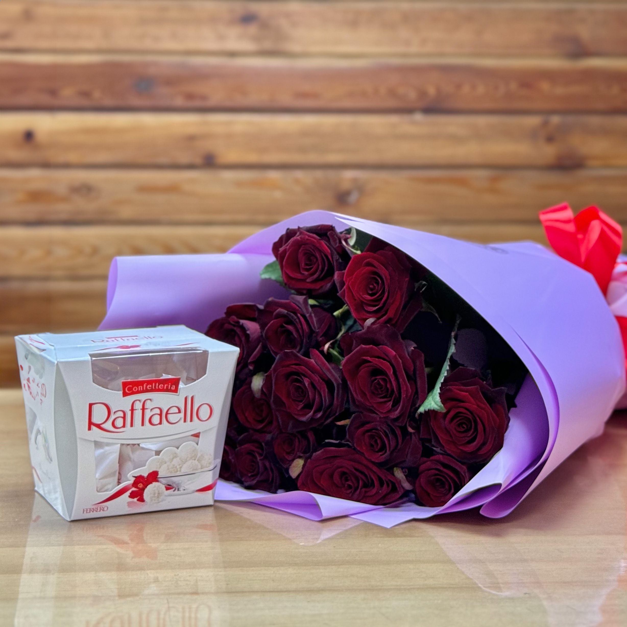 Купити 15 червоних троянд + rafaello з доставкою по Феніксу (США)