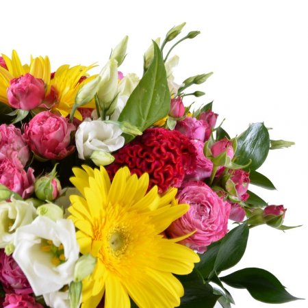 • Склад: Гербера жовта (5 шт.) · Троянди кущові рожеві (5 шт.) · Еустома біла (5 шт.) · Хризантема ромашкова жовта (4 шт.) · Целозія (4 шт.)