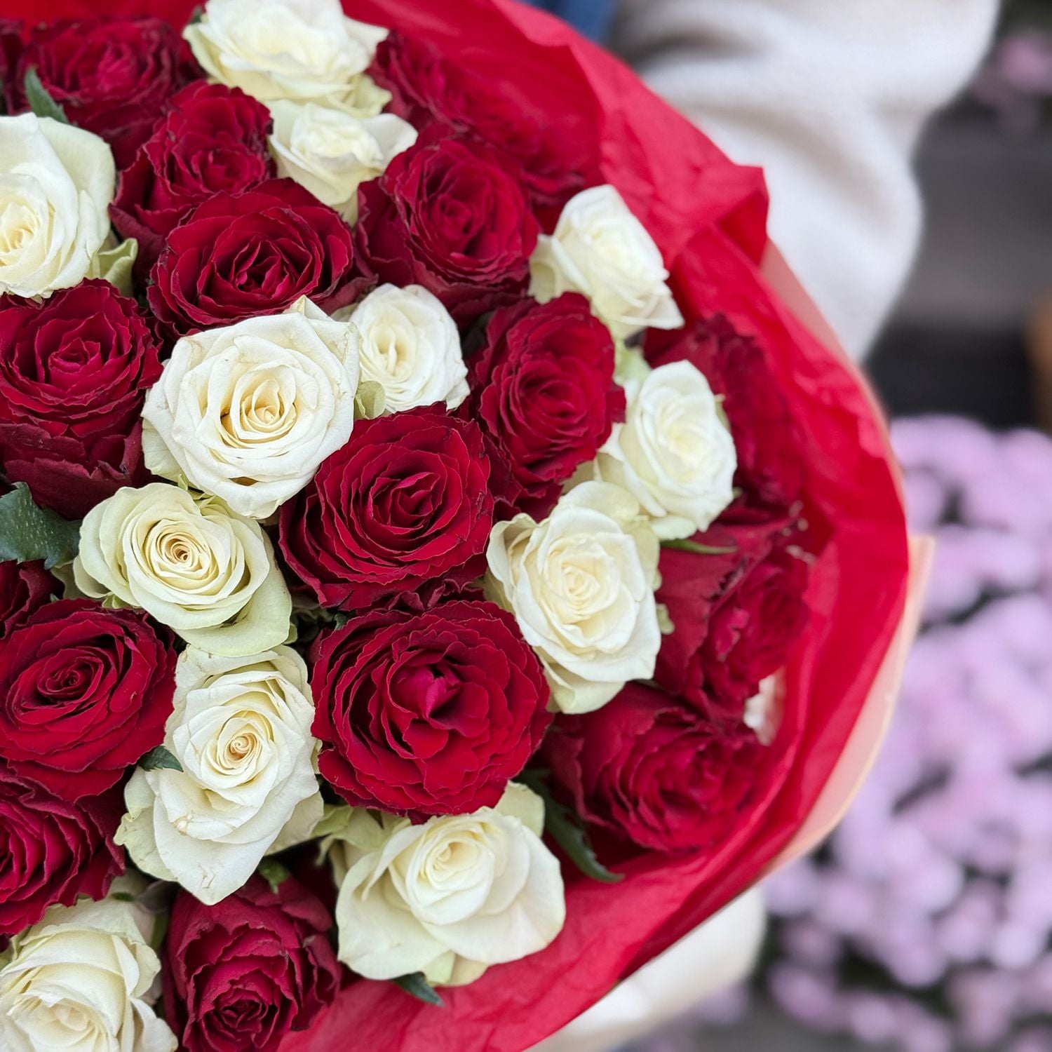 Букет 51 червона та біла троянда Кенія в Самарканді — це чудовий вибір для подарунка на будь-який випадок. Такий букет часто обирають для коханої людини.