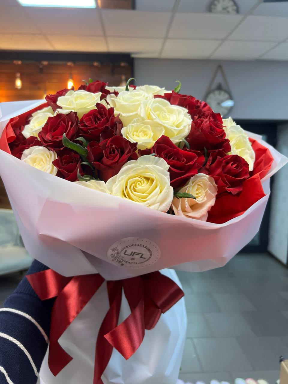 Купити 51 червона та біла троянда Кенія з доставкою по Самбору