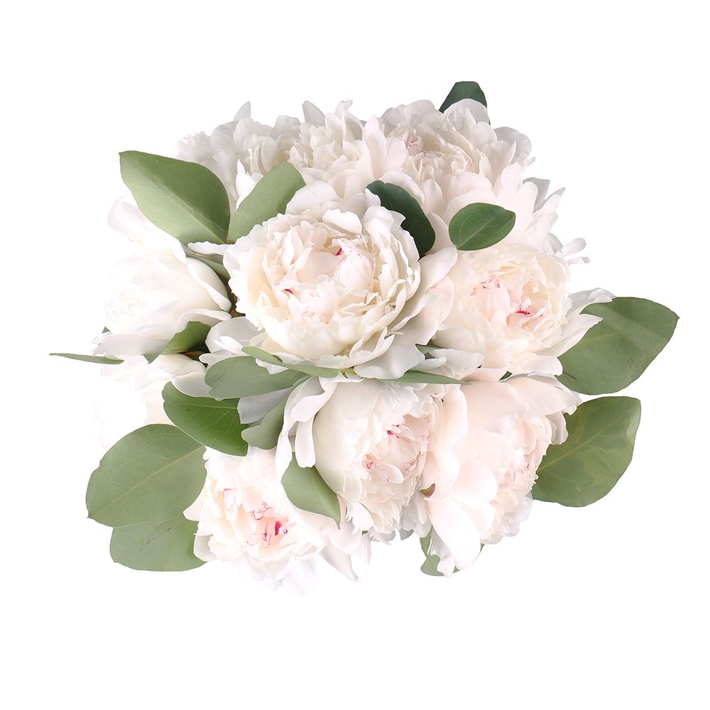 • Склад: Півонія біла (9 шт.) · Евкаліпт (5 шт.) · Стрічка на квіти