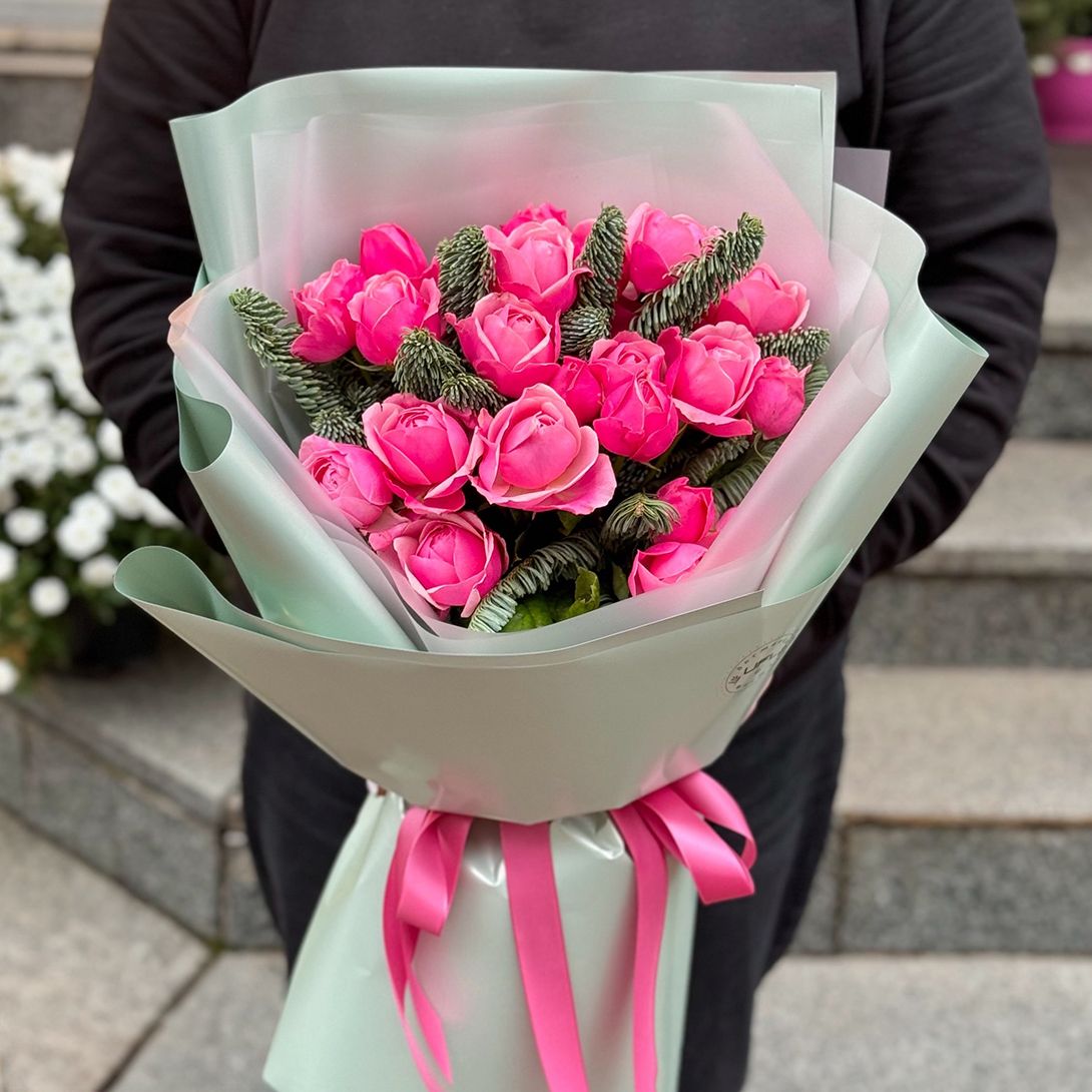 • Склад: Троянда Сільва Пінк (9 шт.) · Гілка ялинки · Стрічка на квіти · Упаковка 4 м
