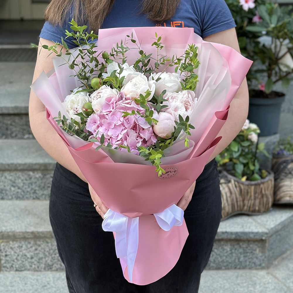У Тунісі Елегантна гармонія півоній та гортензії часто обирають для привітань, романтичних моментів та свят. Такий букет часто обирають для коханої людини.