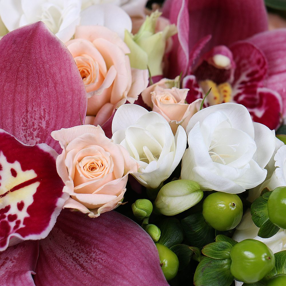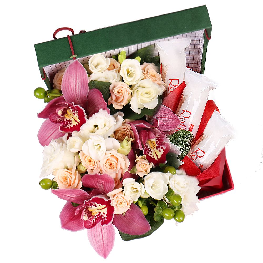• Склад: Троянда кущова кремова (3 шт.) · Еустома біла · Фрезія біла (3 шт.) · Гіперікум зелений · Коробка · Оазис · Цимбидиум рожевий (квітка орхідея) (3 шт.) · Цукерки Raffaello 4 шт. (3 шт.)