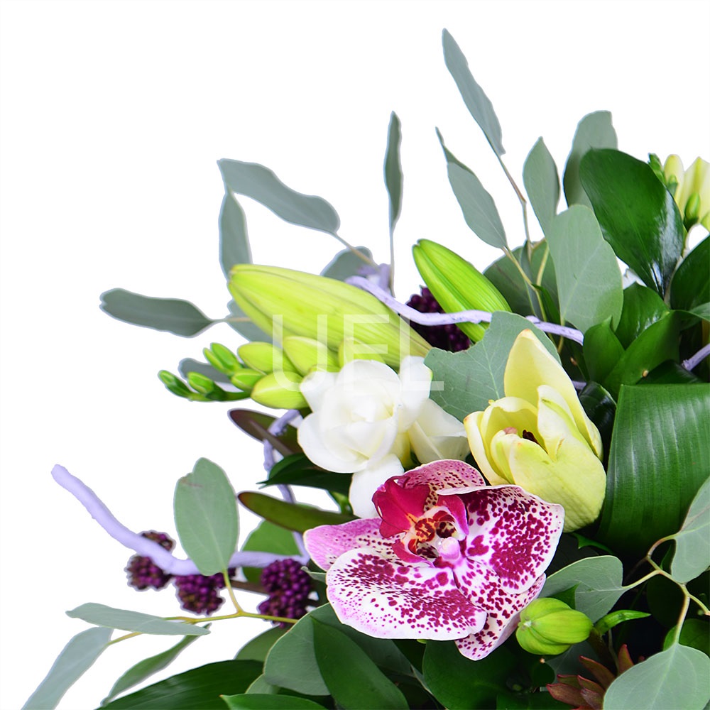 • Склад: Оазис · Лілія біла (2 шт.) · Фрезія біла (3 шт.) · Евкаліпт · Декоративні гілки (2 шт.) · Зелень у букет · Орхидея фаленопсис квітка (3 шт.) · Кашпо L