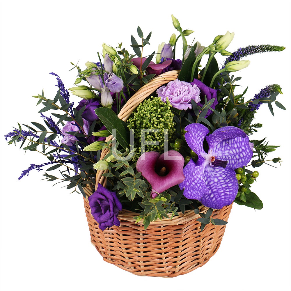 • Склад: Орхідея Ванда · Кали фіолетова (3 шт.) · Гвоздика фіолетова (3 шт.) · Еустома фіолетова (3 шт.) · Вероніка (2 шт.) · Солидаго (2 шт.) · Скімія · Зелень у букет (2 шт.) · Оазис · Кошик M